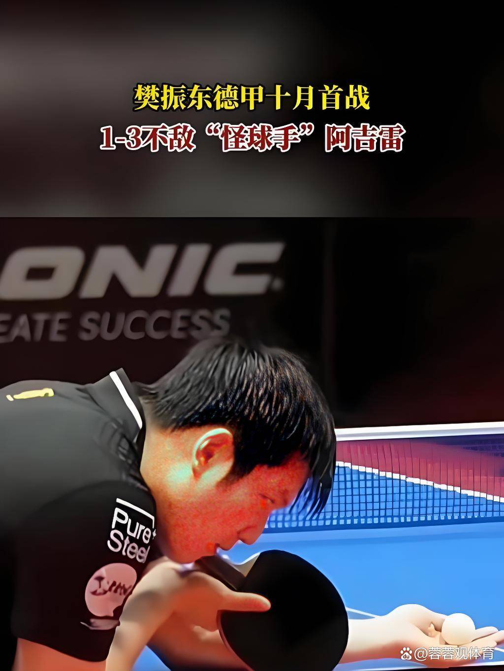 比赛一开始就充满戏剧性。 樊振东首局曾以9:6领先,却被阿吉雷连追数分,最终以10:12丢掉首局。 第二局樊振东以11:6扳回一城,但随后两局却都以6:11的相同比分落败。 全场樊振东显得较为保守,对手的搏杀式打法和怪异节奏让他难以适应。