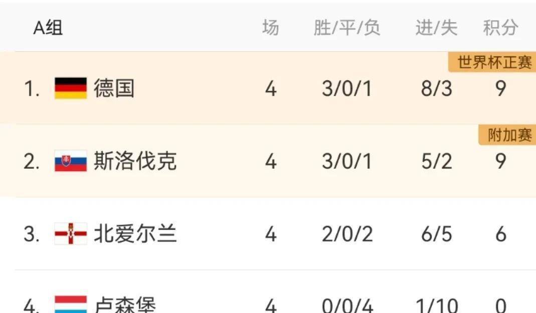 本轮过后,德国队积9分继续排名小组第一,但与斯洛伐克同分,仅凭净胜球优势领先。 北爱尔兰积6分排名第三,仍保有出线希望。