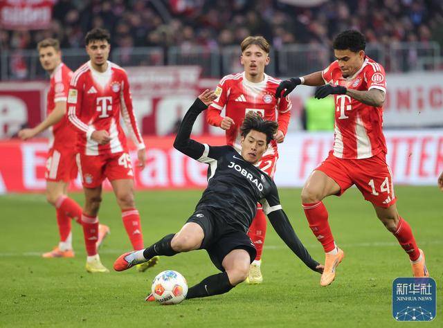 ↑ 拜仁慕尼黑队球员迪亚茨(右一)和弗莱堡队球员铃木唯人(中前)在比赛中拼抢。