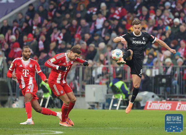 ↑ 拜仁慕尼黑队球员戈雷茨卡(中)和弗莱堡队球员霍勒(右)在比赛中拼抢。