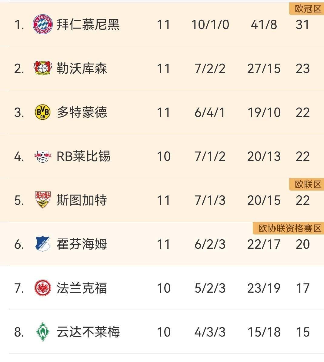本轮比赛过后,德甲积分榜的形势更加明朗。拜仁慕尼黑以8分的优势继续领跑,勒沃库森紧随其后位居第二。多特蒙德由于在主场被对手绝平,积分被斯图加特追平,跌至第三位。斯图加特虽然目前排名第四,但与多特蒙德同积21分,两队之间的竞争依然激烈。