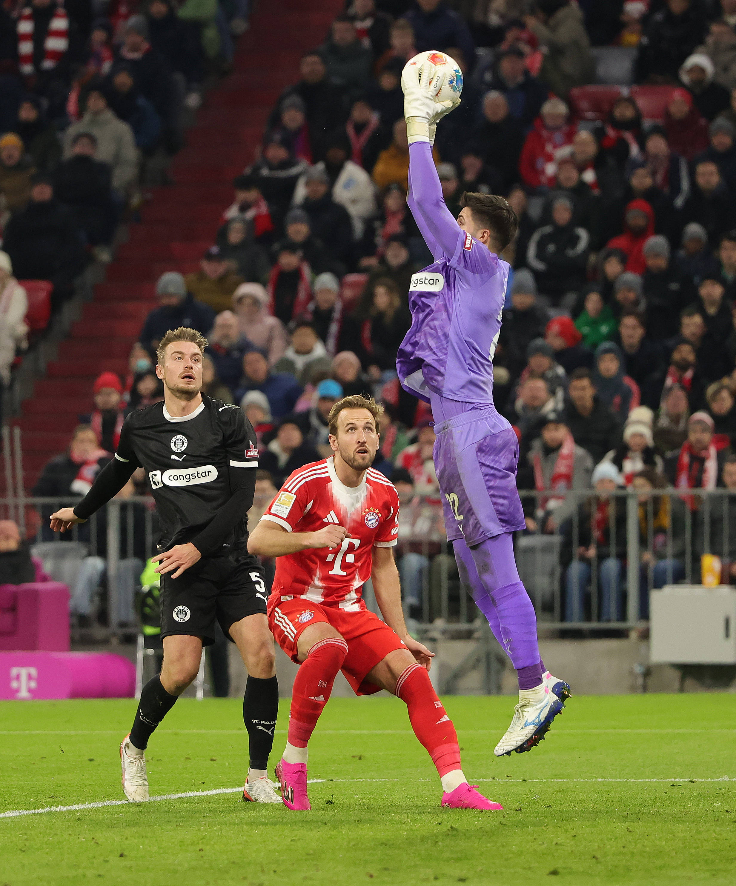 11月29日,拜仁慕尼黑队球员基米希(右)和圣保利队球员埃里克·史密斯(中)在比赛中拼抢。 新华社发(菲利普·鲁伊兹摄)