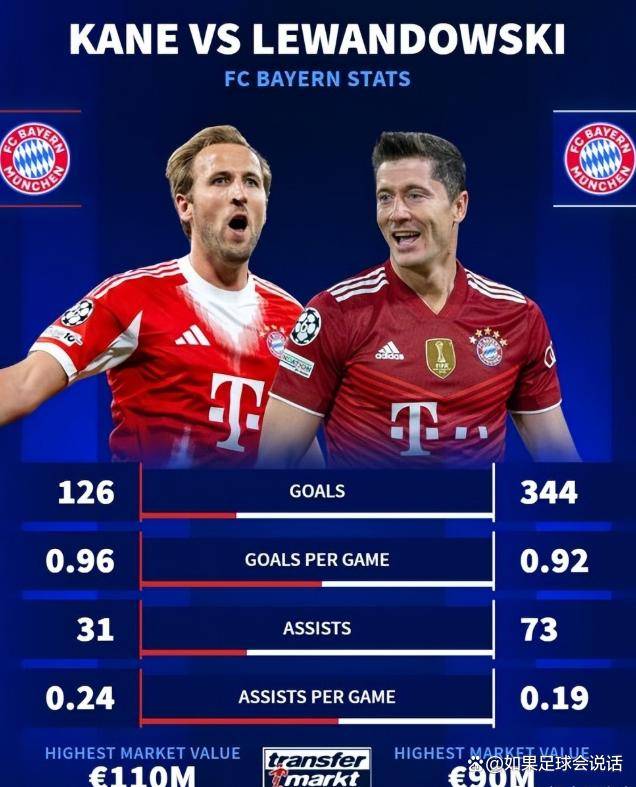 德国转会市场那帮人也是闲得慌,立马把凯恩和莱万在拜仁的数据翻出来做了个对比表