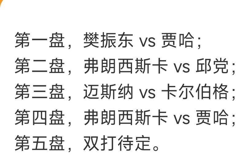 根据赛前公布的对阵表,樊振东被安排在第一盘单打出战,他的对手是美国队的头号男单选手卡纳克·贾哈。贾哈目前世界排名在第22位左右,是近年来美国乒坛的代表人物,曾在巴黎奥运会上与樊振东交手。 赛前,贾哈在自己的视频频道中坦言,面对樊振东这样技术全面的球员,很难找到针对性的战术。 他形容樊振东的防守“难到离谱”,感觉无论自己打出多猛的球,樊振东总能回敬一板更快更猛的。这场对决,从一开始就充满了看点。
