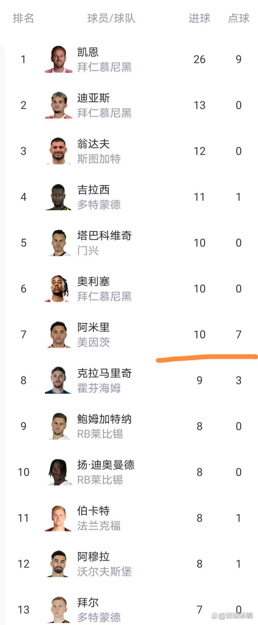 排名第二的迪亚斯,进球数是13 个,和凯恩差了13 球。再后面的昂达夫12 球,吉拉西11 球。
