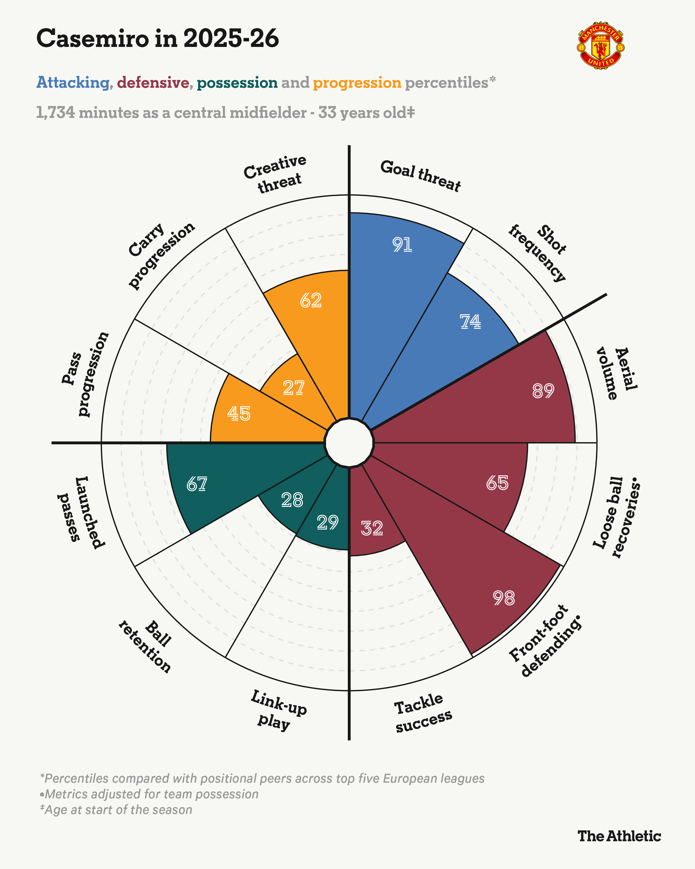 数据显示,卡塞米罗非常喜欢主动防守,在对手控球时铲球或者伸脚拦截的次数在欧洲中场里名列前茅。虽然成功率只有三分之一,但充分体现了他的风格。