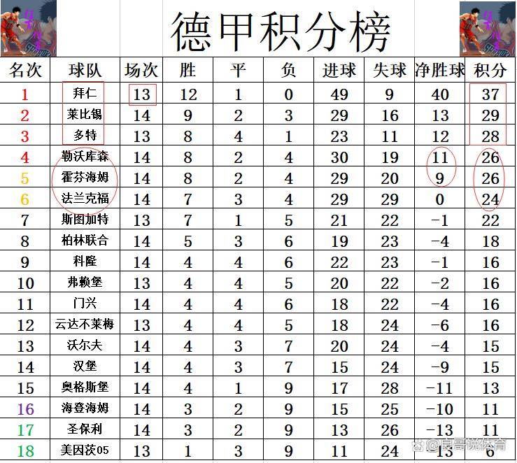 积分榜上,拜仁慕尼黑虽然少赛一场,但仍领先第二名莱比锡8分,领先第三名多特蒙德9分。如果下一轮能够获胜,他们极有可能提前锁定半程冠军。在争夺欧冠资格的行列中,勒沃库森、霍芬海姆和法兰克福在本轮比赛中均取得胜利,使得竞争更加激烈。勒沃库森凭借净胜球的优势排名第四,法兰克福则以2分之差紧随其后,位列第六。