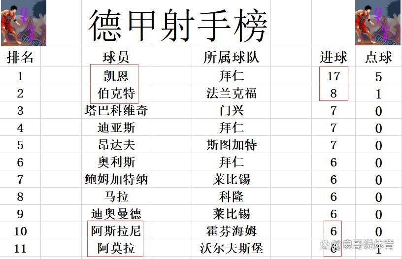 射手榜方面,凯恩以17粒进球遥遥领先,伯克特以8球位居次席,塔巴科维奇、迪亚斯和昂达夫则以7球并列第三。阿斯拉尼和阿莫拉的进球也将射手榜前十的门槛提高到了6球。本轮德甲联赛的精彩落幕,也为球迷们留下了更多的期待。